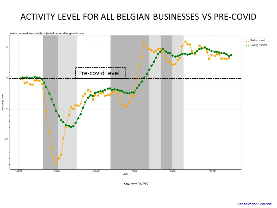 Nous prévoyons que l’économie belge va dépasser son niveau de fin 2019 cette année. Pour l’année entière, la croissance serait de 5,9% cette année-ci et de 3,5% l’année prochaine. Pour le 3e trimestre qui vient de s’écouler, nos derniers chiffres laissent supposer une croissance de 1,4%. Derrière ces chiffres, se cache toutefois une réalité plus complexe.