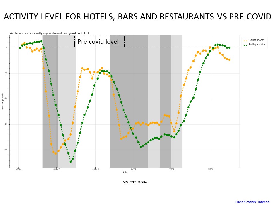 Nous constatons que le niveau d’activité des entreprises tout au long de 2021 était parfois supérieur de 10% au niveau de fin 2019. La moyenne mensuelle montre une légère tendance à la baisse depuis août. Toutefois, cela ne s’applique pas à tous les secteurs. Le graphique suivant illustre la situation de l’horeca.