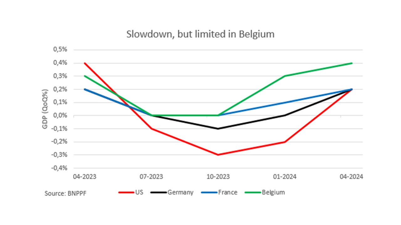 Après un excellent premier trimestre, la croissance belge s’est normalisée ces derniers mois. Aujourd’hui, elle ralentit nettement à cause de la politique monétaire : ralentissement de l’inflation, mais aussi de la croissance, en Belgique et à l’étranger.