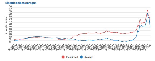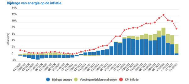 Dit effect werd evenwel volledig tenietgedaan door de dalende trends bij enkele energiedragers. Goedkopere elektriciteit (-0,52 procentpunt) alleen al overtrof de opwaartse prijsdruk van de bovenvermelde voedingsmiddelen. De prijsdaling in aardgas woog nog meer door: tussen december en januari drukten de aardgasprijzen de totale inflatie omlaag met bijna 1,15 procentpunt.